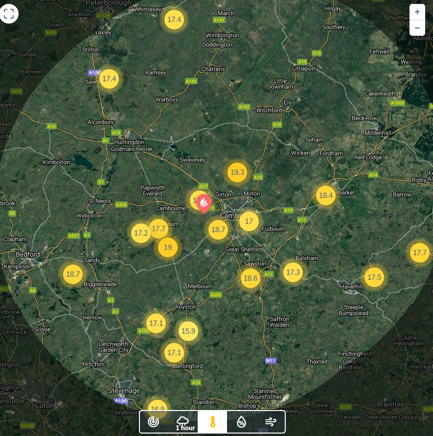 In-app view of the average network temperatures up to 15 miles away.