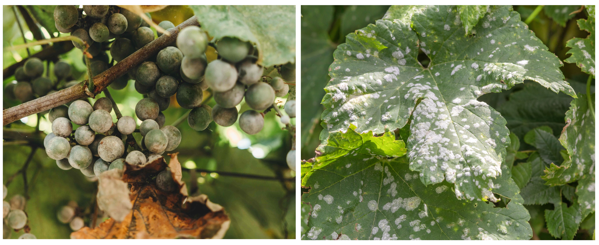 Powdery mildew affects leaves, young shoots, and sometimes even grape bunches.