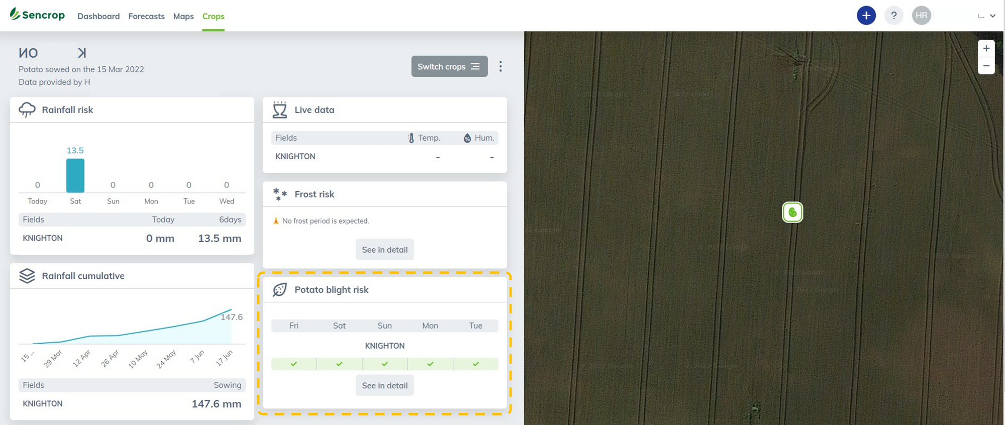 Sencrop app, view on potato field | Orange highlight: blight monitoring feature