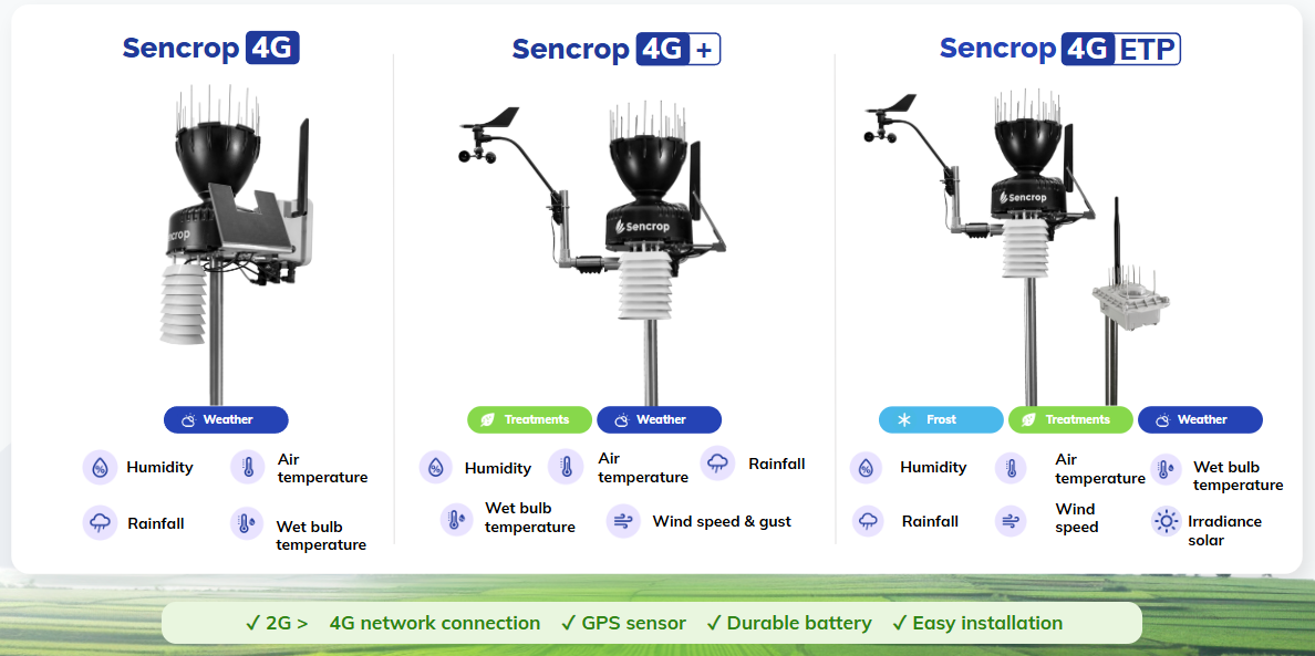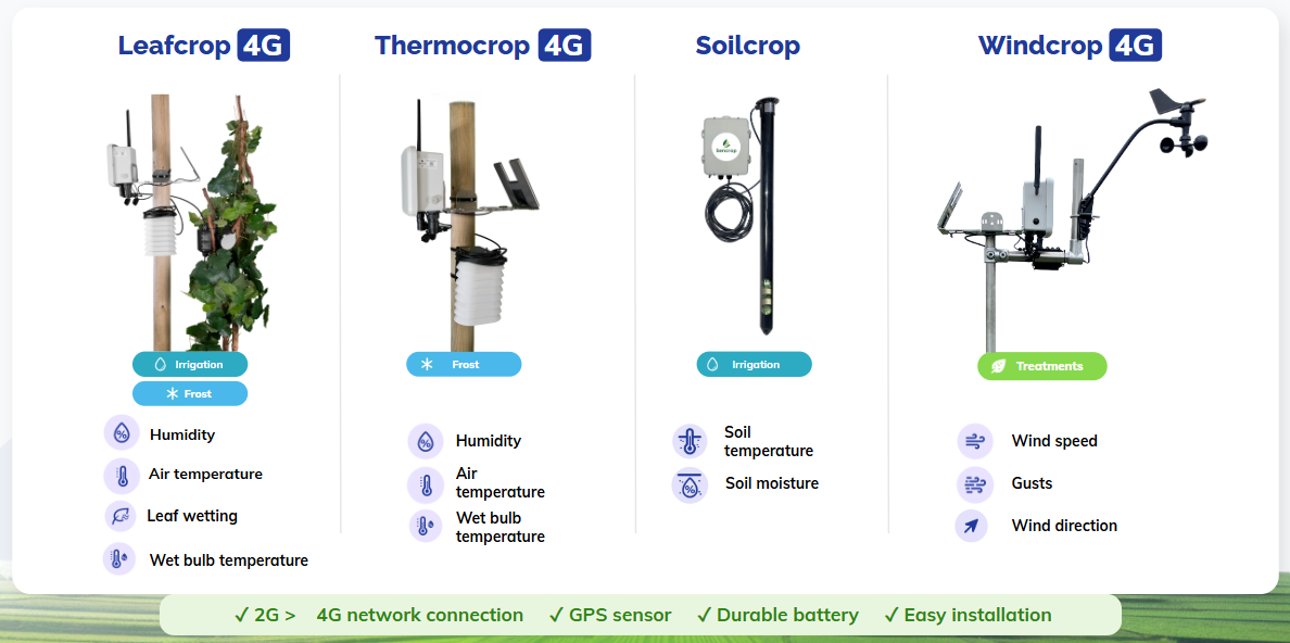 Sencrop 4G: the essentials of weather in a weather station Sencrop 4G+: the ideal weather station for optimising treatments Sencrop 4G+ ETP: the complete weather station, to manage the weather, treatments and especially irrigation.Leafcrop 4G: the precision weather station for monitoring leaf diseases and frost (to be placed near the leaves) Thermocrop 4G: The station for monitoring temperatures at the heart of the foliage (frost) Windcrop 4G: The station for measuring wind in the heart of windy hillsides at risk Soilcrop 4G: The station for monitoring your soil's water needs (capacitive probe)
