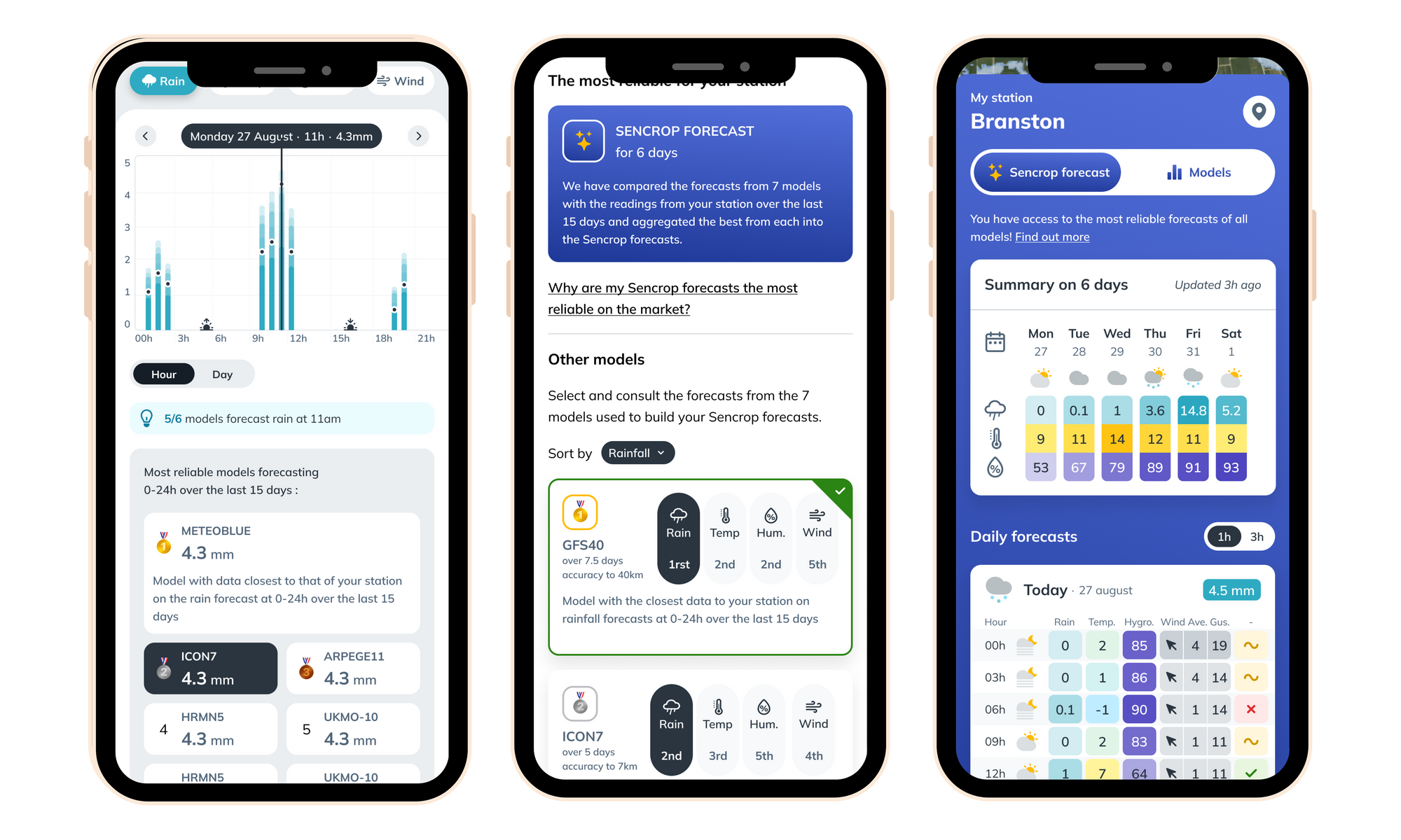 Screens showing the new Sencrop fezatures : Forecast comparator - Model ranking - Sencrop forecast (from left to right)