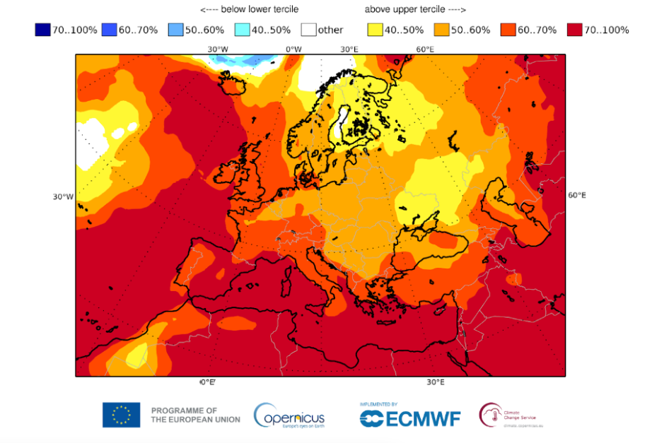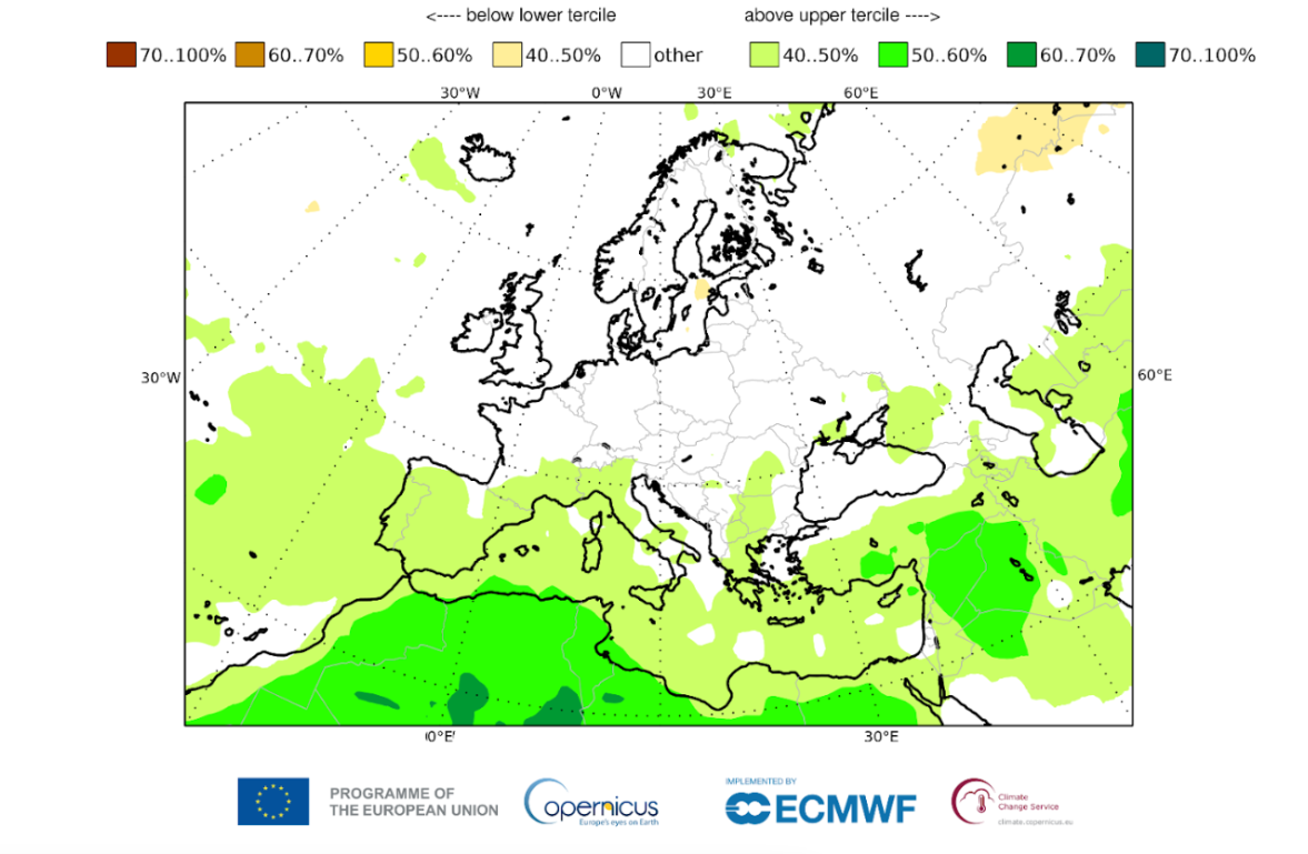 Once again, the whole of Europe is expected to experience above average seasonal values. Southern and Western Europe are mainly affected, covering large areas from the UK to France, Spain and Italy. The Benelux and Germany are also affected, but to a lesser extent.